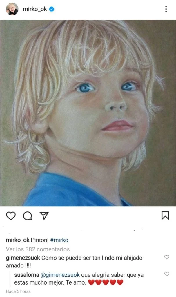 Lejos de sus amigos y allegados en la Argentina, la conductora se volcó a Instagram para intercambiar mensajes con sus allegados. Así sucedió con la última publicación que hizo su ahijado Mirko (en la cuenta administrada por Marley). La diva no pudo resistirte ante la fotografía de un cuadro pintado con el rostro del niño y comentó: "Como se puede ser tan lindo, mi ahijado amado".