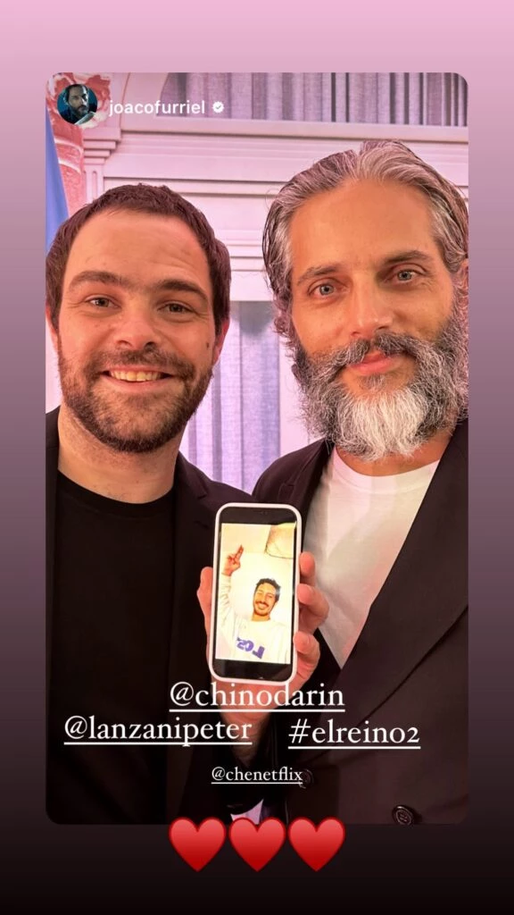 El Chino Darín no asistió al estreno de El Reino 2. Sin embargo, sus compañeros de elenco Joaquín Furriel y Peter Lanzani lo tuvieron presente y, en pleno evento, hicieron una videollamada con él. De esta manera, a través de la pantalla, el actor posó para la foto.