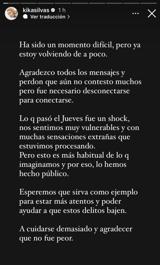 En detalle, Kika Silva subió a sus historias de Instagram una carta abierta sobre el suceso en cuestión, agradeciendo todos los mensajes de apoyo recibidos a lo largo de los últimos días y explicando el motivo por el cual su marido decidió hacer público este episodio repudiable.