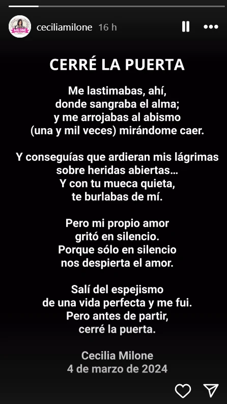 A modo de descargo, Cecilia Milone publicó una poesía en la que dejó entrever que Artaza la lastimó e incluso se burló de ella cuando estalló la polémica.