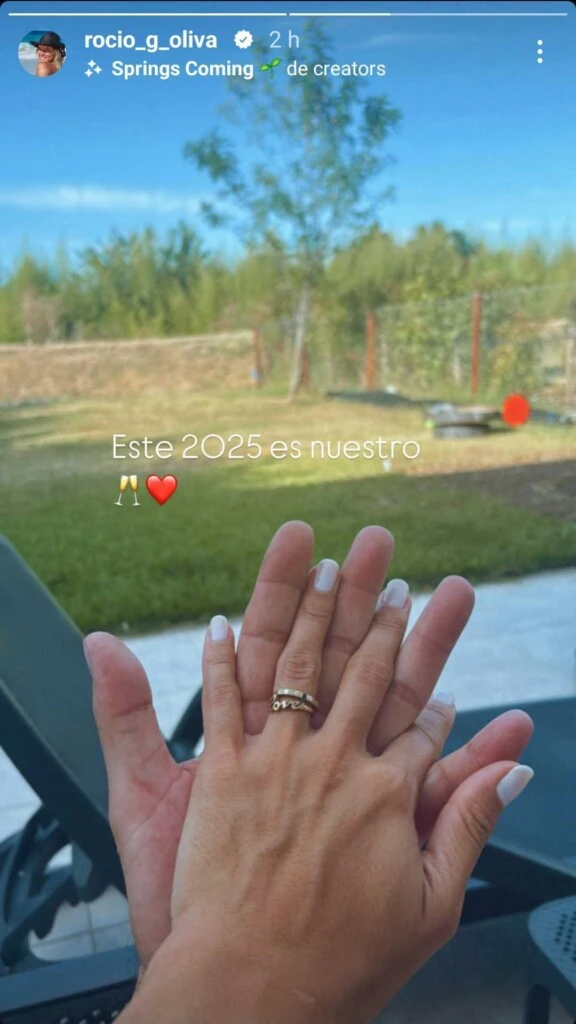 En la imagen, Rocío mostró su mano y la de un hombre entrelazadas. "Este 2025 es nuestro", escribió la joven sobre la postal, sumándole un emoji de brindis y un corazón rojo. El detalle que llamó la atención de sus seguidores es el particular cintillo que lleva en el dedo anular.