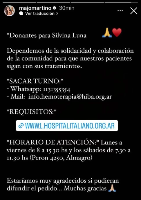 “Donantes para Luna Silvina: dependemos de la solidaridad y colaboración de la comunidad para que nuestros pacientes sigan con sus tratamientos”, reza el texto que compartió Majo Martino y ya se viralizó en las redes.