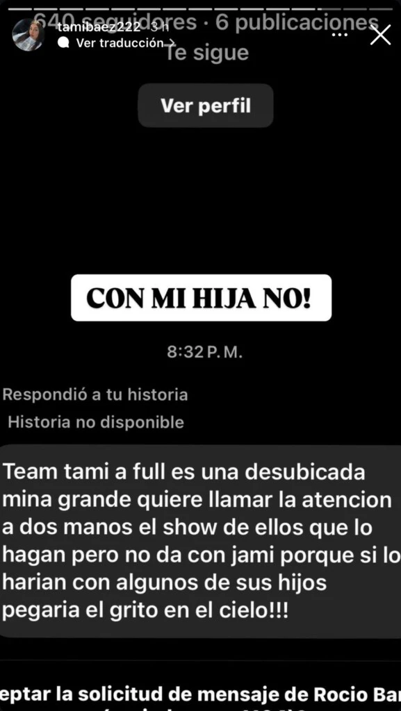 Luego, la mediática compartió otro mensaje que le llegó y decía: "Team Tami a full, es una desubicada. Mina grande quiere llamar la atención. A dos manos el show de ellos, que lo hagan, pero no da con Jami, porque si lo hicieran con algunos de sus hijos pegaría el grito en el cielo". A lo que Tamara sentenció: "¡Con mi hija no!".