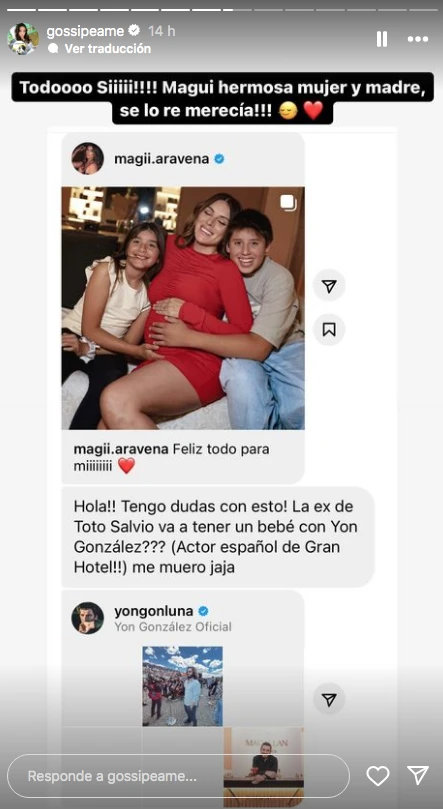 Rápidamente, el posteo se llenó de likes y comentarios de felicitaciones. Y, una de las consultas más frecuentes fue: "¿Quién es el padre del bebé?". A lo que Pochi de @gossipeame compartió el mensaje de una seguidora, respondiéndole dicho posteo, y asegurando que el padre del bebé en camino bien podría ser el reconocido actor español Yon González, con quién Magalí confirmó su romance semanas atrás.