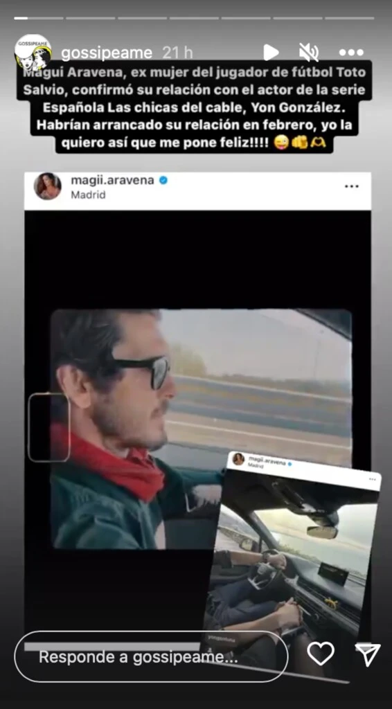 "Magui Aravena, exmujer del jugador de fútbol Toto Salvio, confirmó su relación con el actor de la serie española Las chicas del cable, Yon González", lanzó dando la información con las capturas que acreditaban sus palabras. Luego, agregó: "Habrían arrancado su relación en febrero".