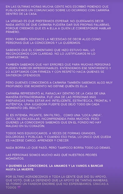 Además, destacaron el desempeño que Carmiña tuvo dentro de la casa y su participación representando a Paraguay en el reality. “Fue una de las personas más preparadas para estar ahí: inteligente, estratégica, frontal y auténtica. Una jugadora fuerte que dejó todo en cada momento del reality”, señalaron.