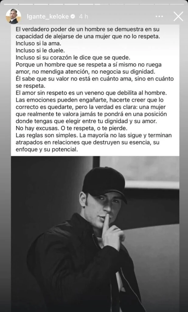 Él sabe que su valor no está en cuánto ama, sino en cuánto se respeta", comienza diciendo el mensaje de L-Gante en sus historias de Instagram