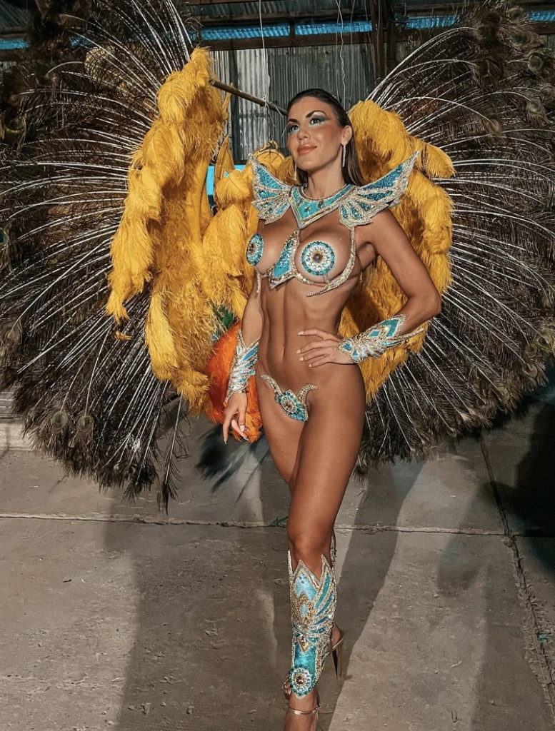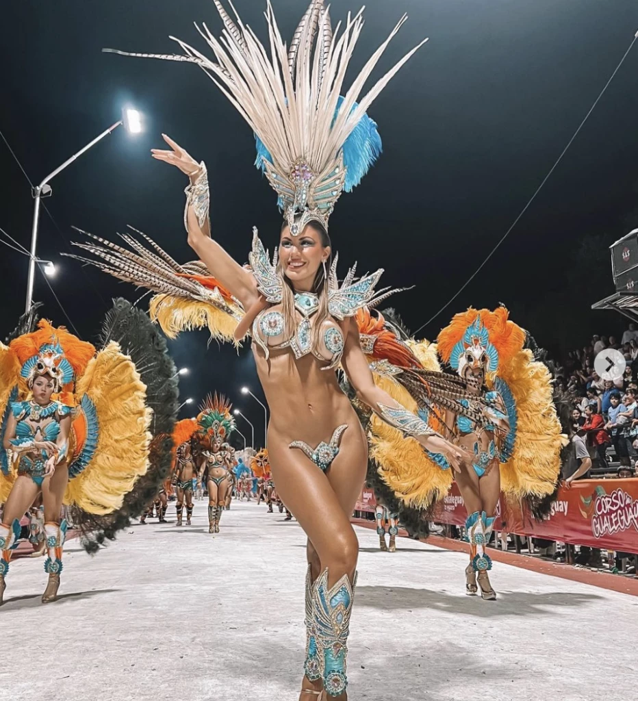 Según se puede apreciar en las fotos que Muri López compartió en sus redes sociales, la mujer del deportista se mostró con un casco de frondosas plumas de avestruz celestes y blancas, con algunas otras que usó como respaldar para acompañar el osado biquini bordado con piedras a tono que llevó puesto, característico de estos carnavales. Tras las repercusión de las fotos de infarto+, la novia de Lisandro Martínez habló de su pasión por el carnaval.