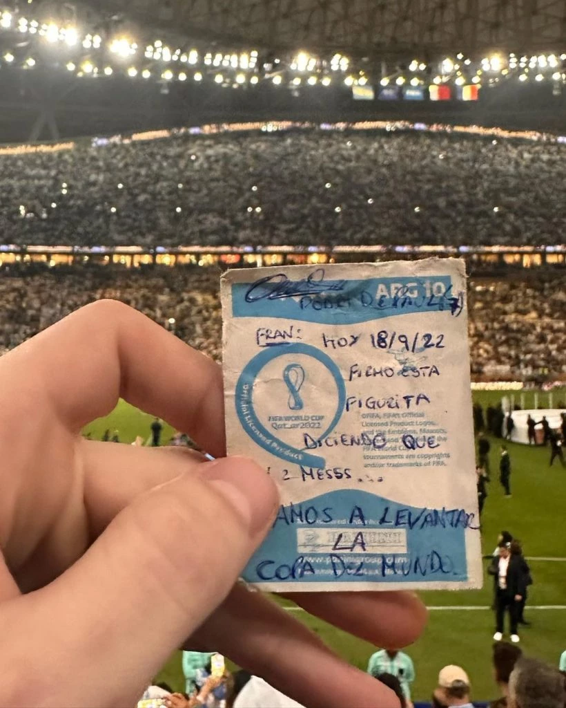 “Fran: hoy 18/9/22 firmo esta figurita diciendo que en meses... Vamos a levantar la Copa del Mundo”, escribió el futbolista, con firma incluida. De hecho, De Paul se sacó una foto con el dorso de la figurita y una pícara sonrisa.