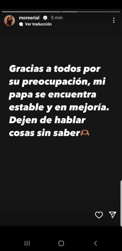 More Rial fue quien tomó la posta de la comunicación y usó la llegada en sus redes sociales para llevar tranquilidad. "Mi papá se encuentra estable y en mejoría", señaló, al mismo tiempo que agradecía la preocupación y pedía silencio antes que inventar rumores con mala saña.