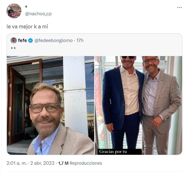 Nacho no pudo evitar la sorpresa al ver las imágenes pasear por su pantalla, y en su cuenta de Twitter se hizo eco de las postales de Rodo. "Le va mejor que a mí", sentenció con humor para sus casi 200 mil seguidores.