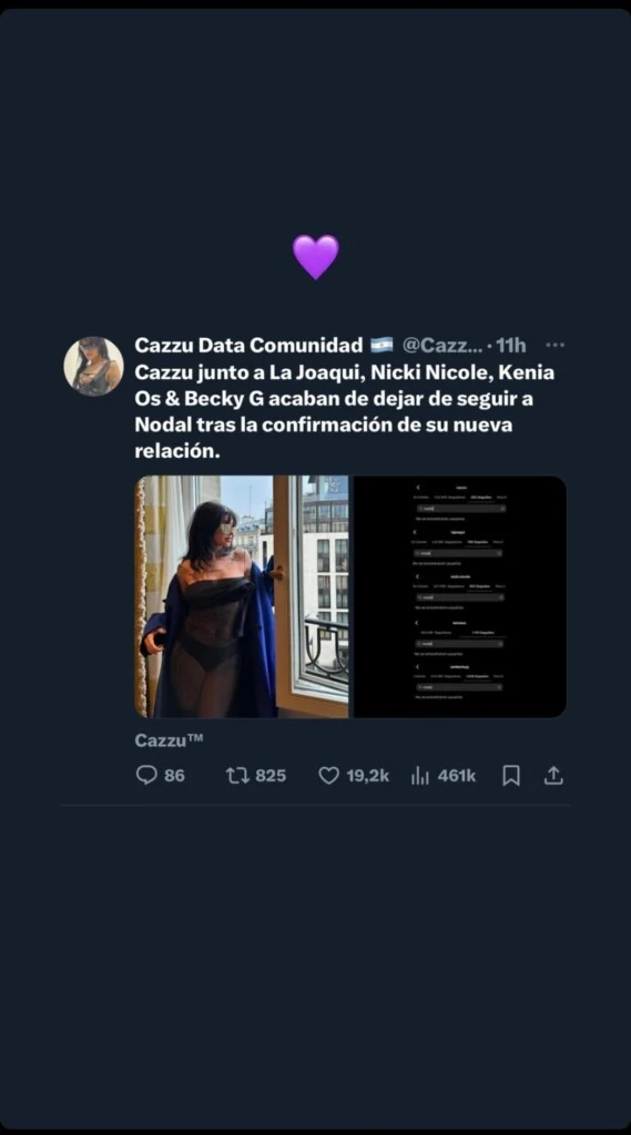 Es así que desde el día de ayer La Joaqui, Nicki Nicole, Lali, Becky G y Kenia Os dejaron de seguir en sus redes sociales al artista mexicano, hecho que no fue pasado por alto por los fanáticos de Cazzu que lo viralizaron en redes sociales.