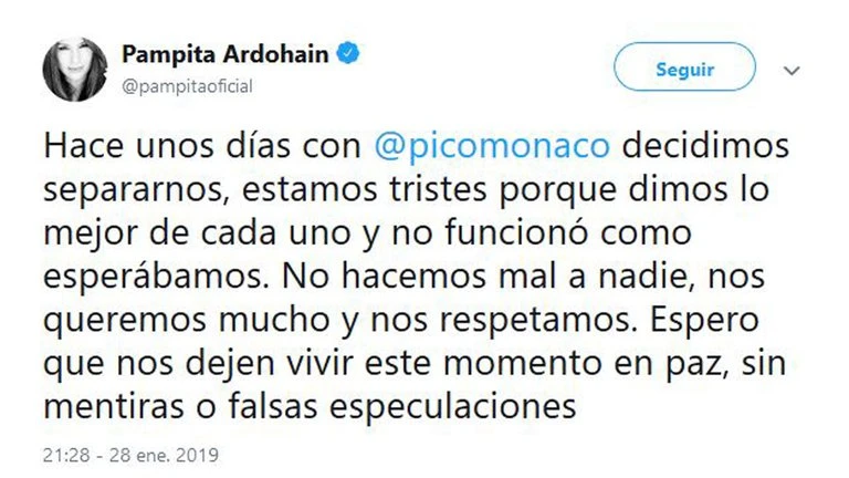 "Hace unos días con @picomonaco decidimos separarnos, estamos tristes porque dimos lo mejor de cada uno y no funcionó como esperábamos. No hacemos mal a nadie, nos queremos mucho y nos respetamos. Espero que nos dejen vivir este momento en paz, sin mentiras o falsas especulaciones", escribió la modelo desde su cuenta oficial en Twitter por entonces.