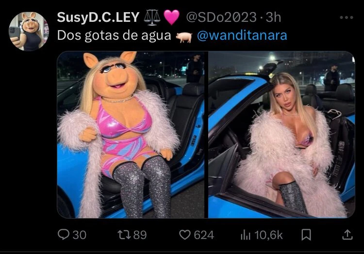 Ahora, una usuaria tomó una foto del rodaje de Wanda en Brasil, donde recientemente filmó el videoclip del remix de O bicho vai pegar, y la editó convirtiéndola en el simpático personaje de la cerdita, amiga de la Rana René y creación del titiritero estadounidense Jim Henson.