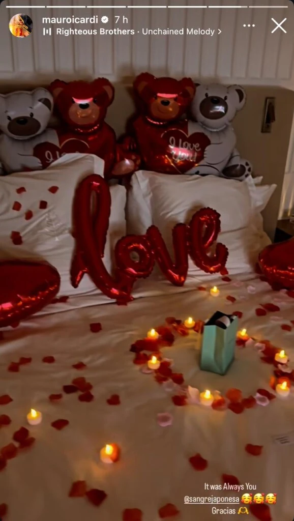 A través de un video que subió Mauro Icardi a sus historias de Instagram, se lo puede ver entrando a una habitación de hotel, descubriendo la increíble sorpresa que había adentro. Es que, al ingresar, se puede ver que en la televisión había una foto de la pareja y unos globos que decían "I love you (yo te amo)".