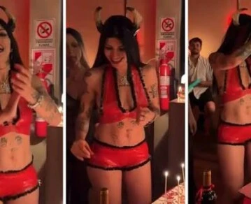 Es un vestido con corte sirena y escote en ve profundo que contornea perfectamente su silueta y destaca la pequeña cintura de la cantante. Confeccionado en devoré -un material parecido al chifón y el terciopelo pero con otra textura- el detalle que destaca el look es la carterita de plumas, última tendencia en materia de moda.