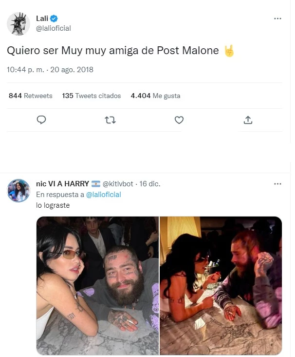 Además, ayer se encontró con el músico estadounidense Post Malone. En un tuit de 2018, Lali había expresado su deseo de ser "muy muy amiga" de este artista. Ayer lo conoció y posaron para las fotos, que la cantante compartió orgullosa en su Instagram.