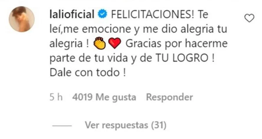 "Como verán soy muy fan de Lali, ella representa mucho en mi vida, como vino de abajo, sin contactos que la ubiquen, ni ventajas de por medio. Todo se lo ganó absolutamente sola y es ahí cuando siento orgullo de la REINA DEL POP ARGENTINO", escribió el muchacho junto a la fotografía que Lali comentó. "FELICITACIONES! Te leí, me emocioné y me dio alegría tu alegría! Gracias por hacerme parte de tu vida y de TU LOGRO ! Dale con todo!", fue la inesperada respuesta de Espósito.