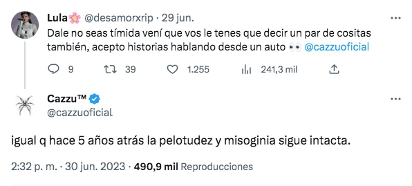 A Cazzu le pidieron su opinión sobre el tema y ella respondió el tuit en un tono más moderado, pero igual de harta: "Igual que hace 5 años atrás, la pelotudez y misoginia sigue intacta". Y es que, como recapitulamos más arriba en esta nota, no se entiende cómo Coscu sigue actuando de tal manera sin consecuencias.