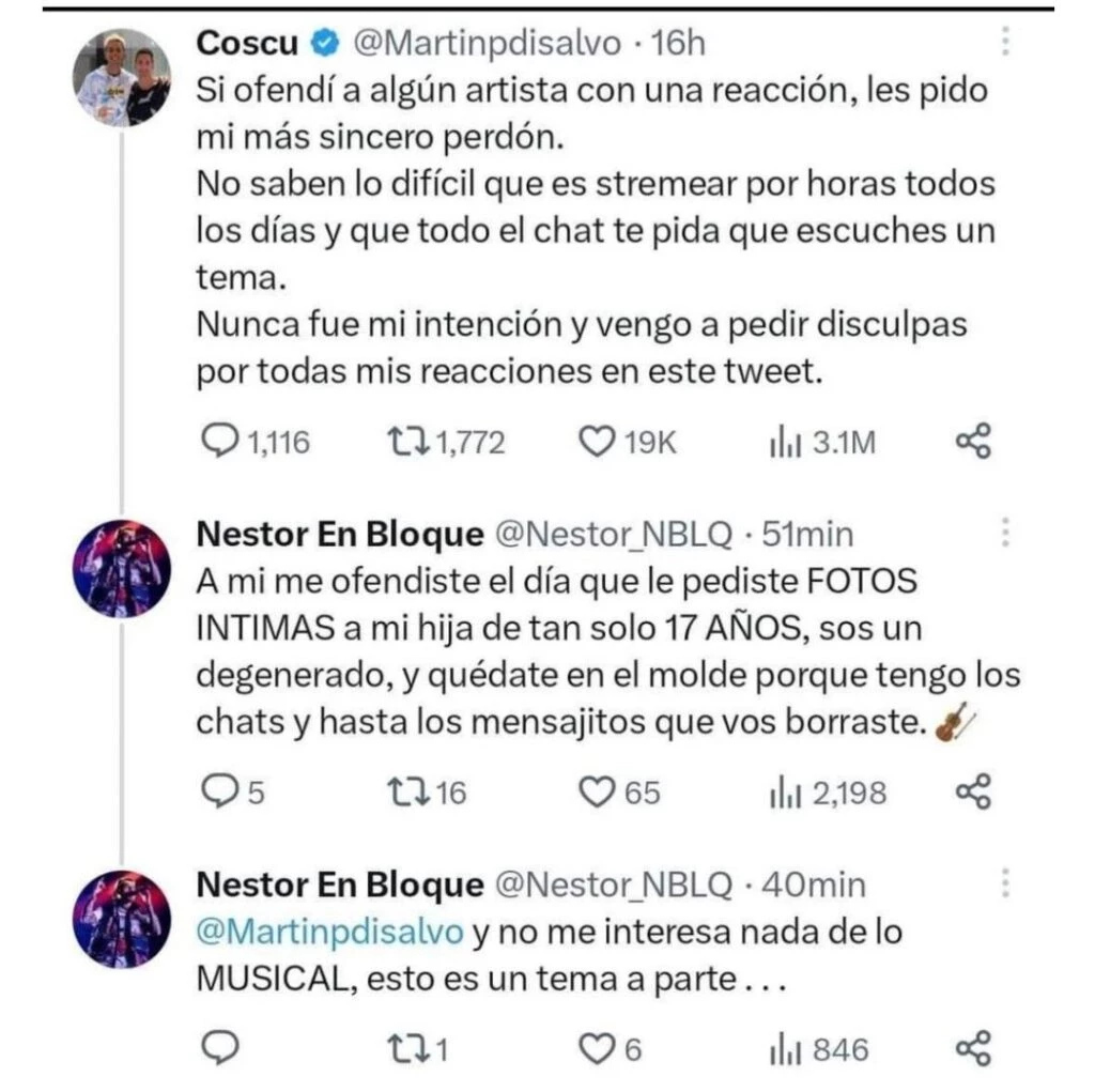 Sin ir más lejos, y como coletazo también de este escándalo, el cumbiero Néstor en Bloque cruzó a Martín Di Salvo por haberse metido con su hija menor de edad. "A mí me ofendiste el día que le pediste FOTOS ÍNTIMAS a mi hija de tan solo 17 años. Sos un degenerado, y quedate en el molde porque tengo los chats y hasta los mensajitos que vos borraste. Y no me interesa para nada lo musical, eso es tema aparte", tuiteó a viva voz.