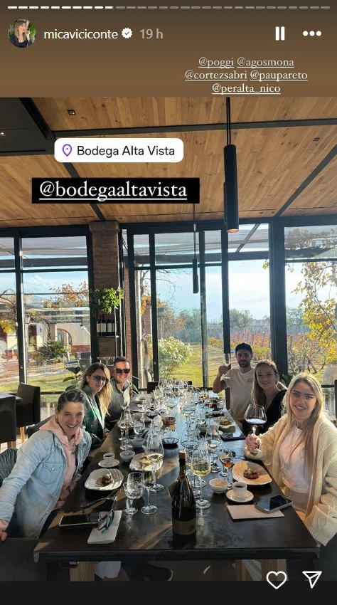 Luego de la tarde que vivieron en la bodega, Viciconte subió un video en su cuenta de Instagram donde se veía un resumen de todo lo que hicieron. "Un viaje fugaz a Mendoza, la tierra del buen vino. No perdimos el tiempo... degustamos un menú de siete pasos con fusión francesa argentina. Obvio, no paramos de brindar y reírnos", detalló Mica ante sus casi cuatro millones de seguidores.