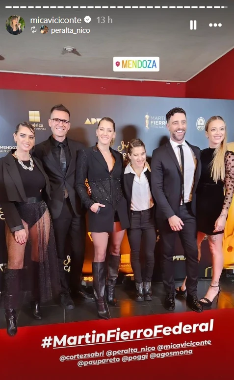 Por la noche, Mica subió unas historias en la alfombra roja y en los Premios Martín Fierro Federal, junto al grupo de Telefe con los que viajó. Por lo que se puede ver, todos optaron por outfits negros y blancos. Los dos hombres se pusieron un traje negro, Diego eligió una camisa blanca, mientras que Nico se puso una negra. A su vez, Pau también optó por un traje, con camisa blanca, y pantalón achupinado.