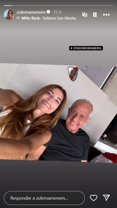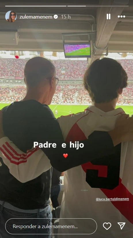 Luego, la hija del expresidente Carlos Saúl Menem compartió una segunda postal, en la que se lo veía a Luca Bertoldi Menem, su primogénito, con la camiseta de River, abrazado a su padre, Paolo Bertoldi. "Padre e hijo", escribió Zulemita, junto a un emoji de un corazón rojo, retratando este momento especial de su exmarido con su hijo mayor.