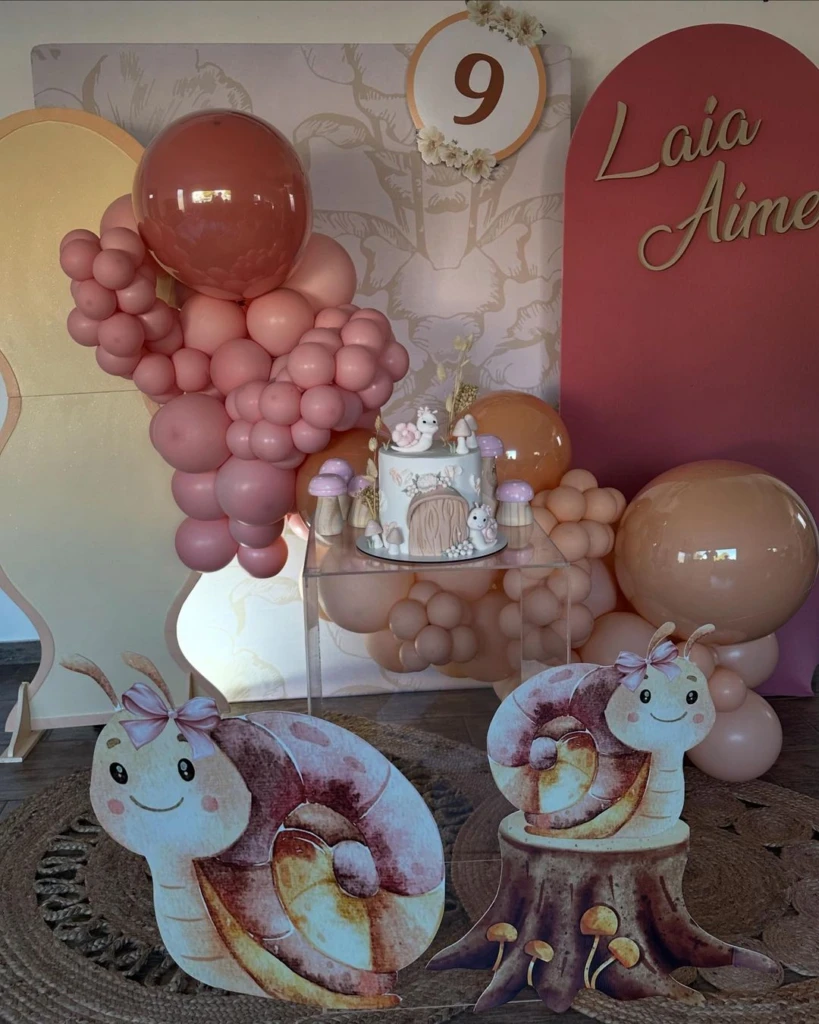 En el centro de la decoración, había una mesa que sostenía una torta llena de detalles encantadores: pequeñas figuras de caracoles, setas y flores que seguían una temática de bosque encantado.