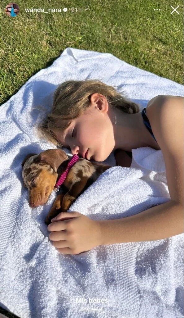 En otras de las postales compartidas por la conductora de Telefe se puede ver a su hija Francesca descansando junto a Cookie, la perrita salchicha que sumaron a su familia recientemente.