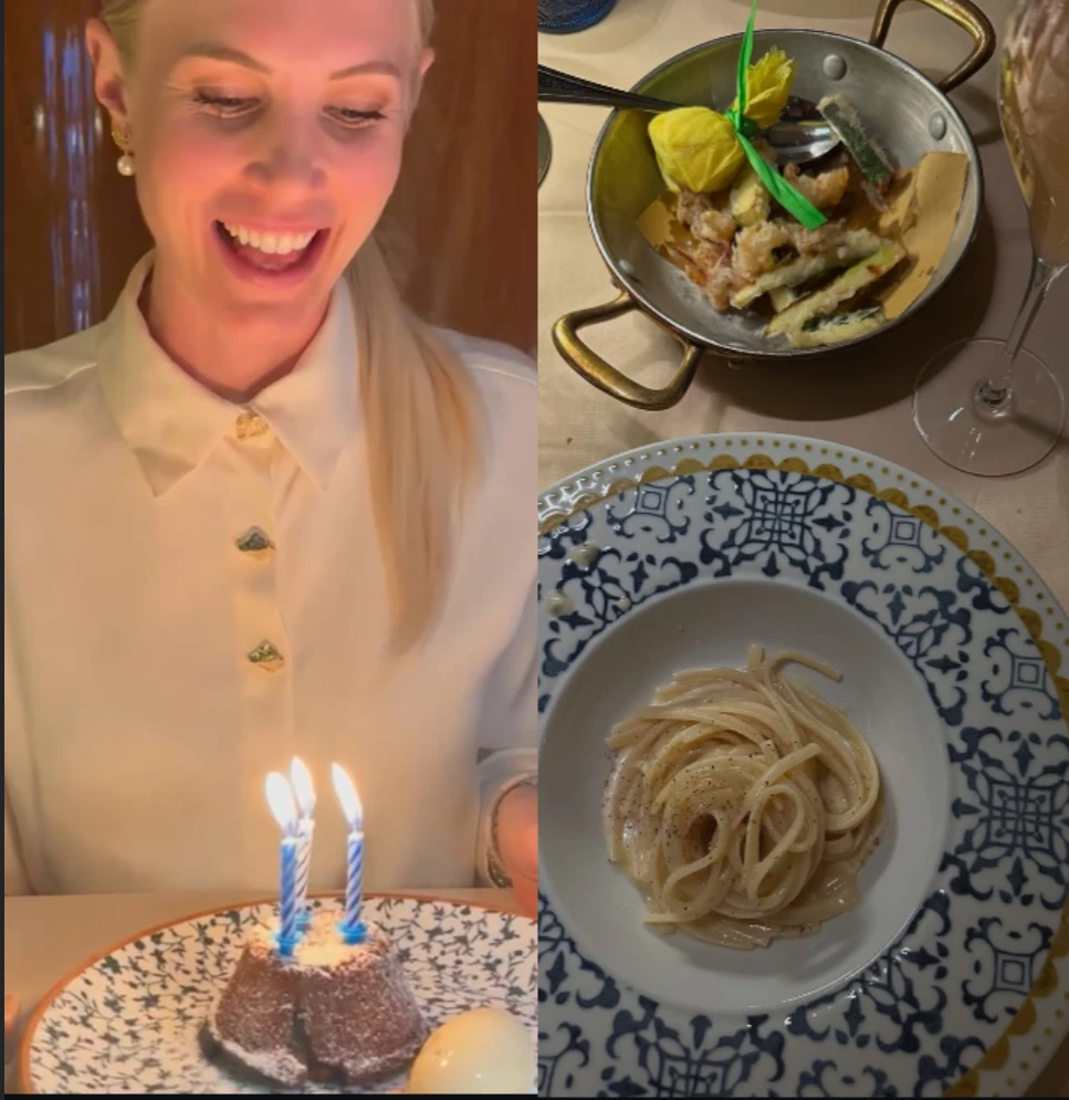Su elección esta noche fue un delicioso platillo de pasta gourmet que acompañó con una copa de vino blanco. Y volvió a soplar las velitas pero esta vez con un volcán de chocolate.