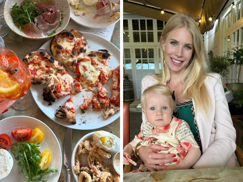 Christiansson se decidió por una degustación de diferentes platillos para picar. Pasaron del jamón crudo y la burrata, a los vegetales (tomate cherry y verdes). También degustaron de rabas y pizza clásica de salsa con mozzarella y brindaron con Aperol.