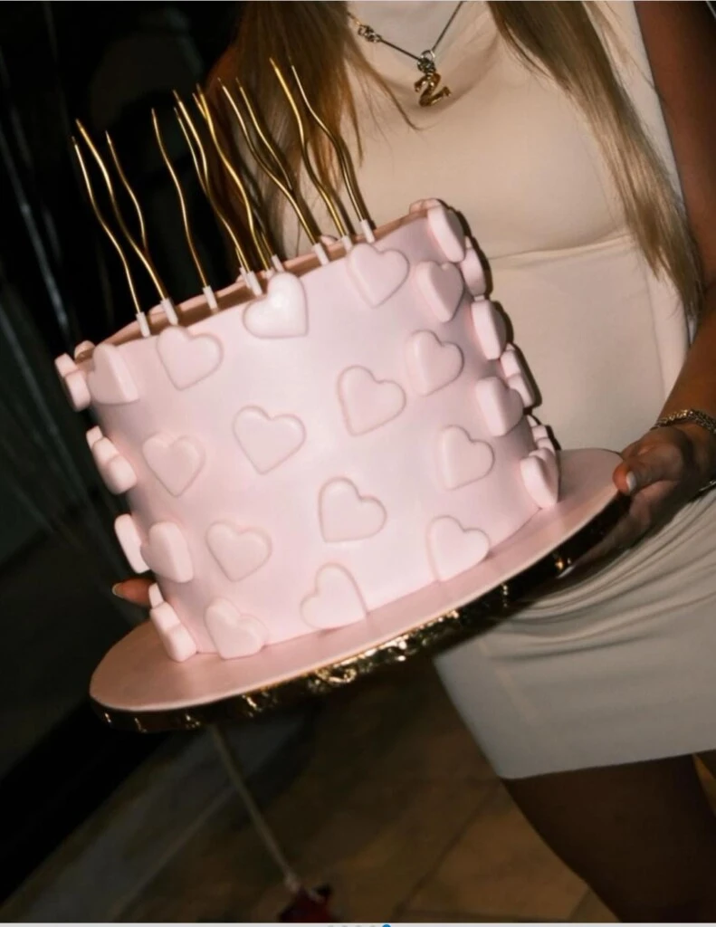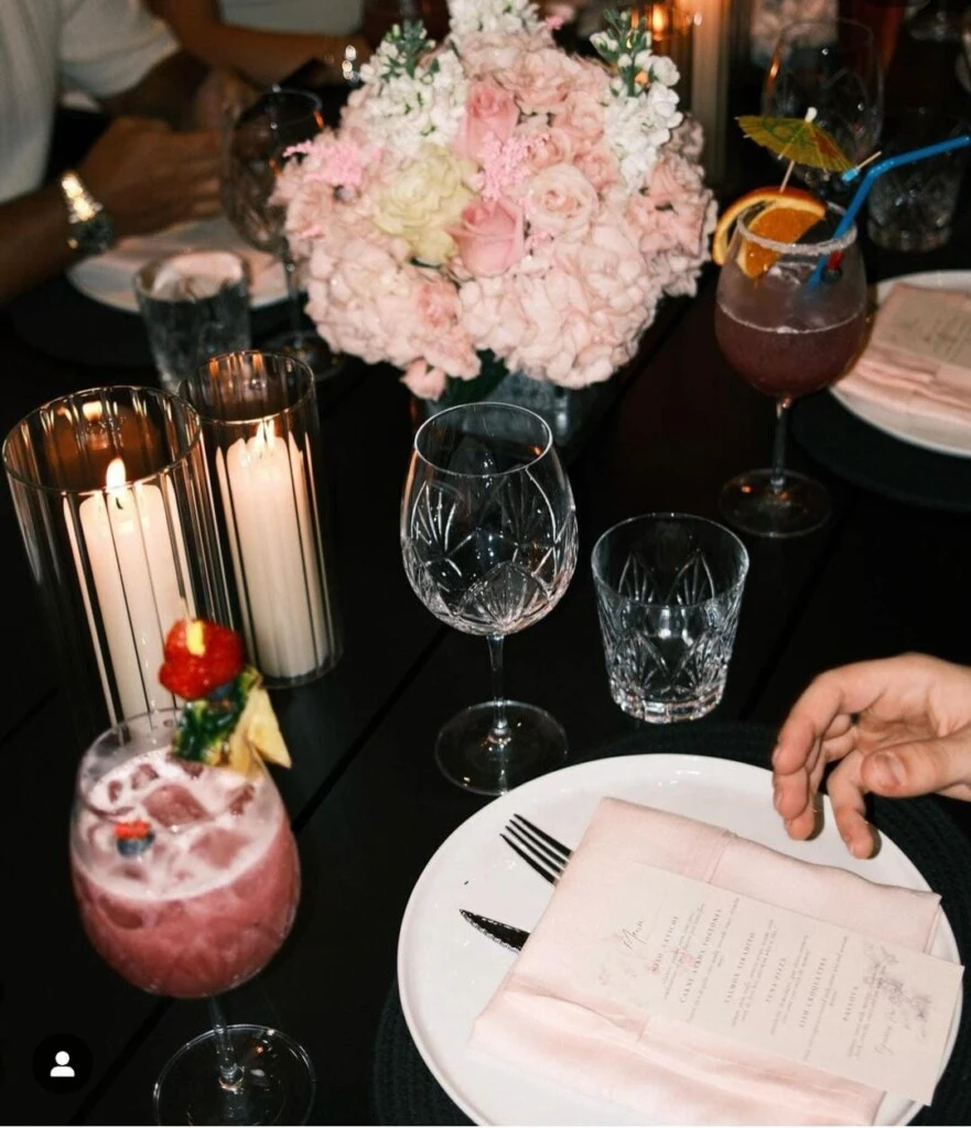 En cuanto a la torta con la que sopló las velitas estuvo decorada al mejor estilo romántico: con corazones en color rosa y velas doradas onduladas, muy en tendencia. Cada mesa incluyó un arreglo floral también con colores pasteles, velas y cada invitado tenía un menú para elegir qué platillo degustar en esta noche.