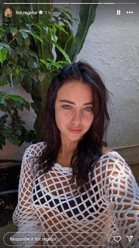Luego de algunas horas en Ibiza, la mayor de las hermanas Regidor subió otra historia a su cuenta de Instagram en la que se mostró posando con un look playero. Es que sobre una malla negra con bordes blancos, ella se puso un vestido de crochet haciendo juego.