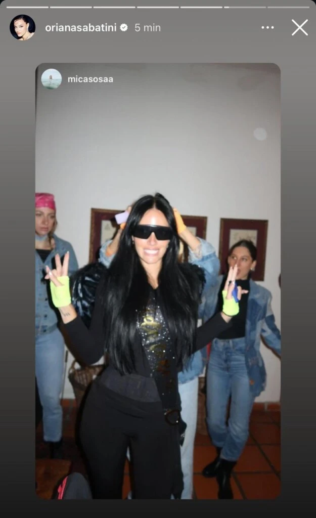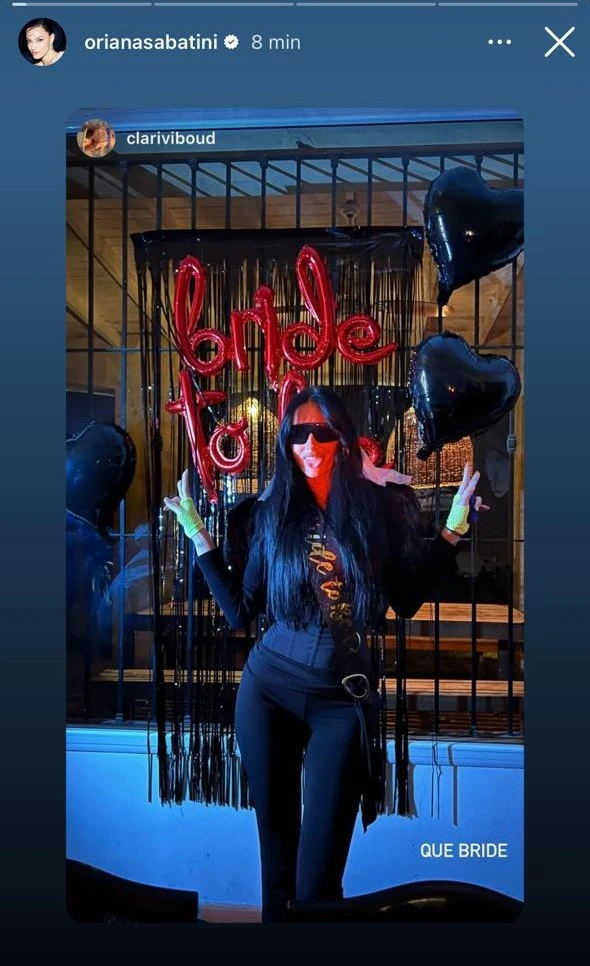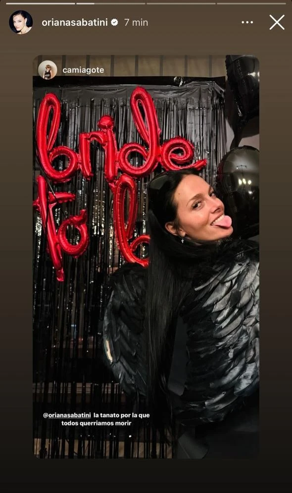 Al comienzo de la noche, Oriana se sacó algunas fotos en este espacio que armaron, y compartieron las postales en las redes sociales. En estas imágenes, se puede ver que la actriz se vistió toda de negro, con anteojos del mismo color y unos guantes amarillos. A su vez, las amigas le dieron una cinta, que se colgó en el hombro, que decía 'bride to be'.