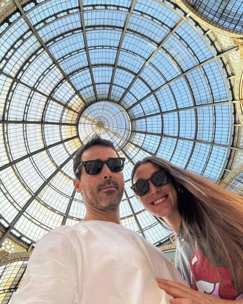 Una de las selfies elegidas por ambos se los puede ver contetnos en la icónica Galleria Vittorio Emanuele II en Milán, donde la pareja posa bajo la famosa cúpula de vidrio. Ambos lucen gafas de sol negras, con Nacho en una camiseta blanca básica y Lucía con una remera estampada, manteniendo un estilo relajado pero moderno.