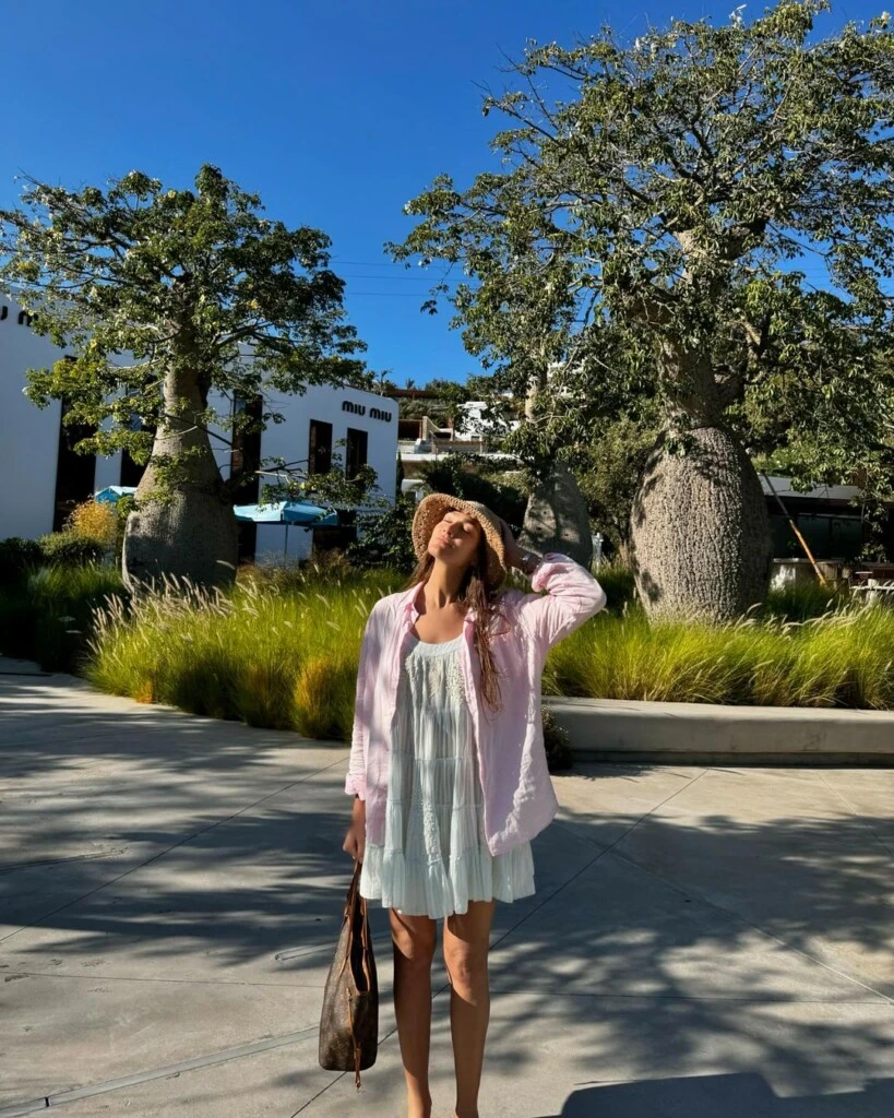 Otra postal muestra a Lucía Pedraza posando al aire libre con un vestido blanco veraniego, de estilo boho, acompañado de una camisa oversize rosa claro y un sombrero de ala ancha que completa su look fresco y chic para pasear por las calles europeas. El atuendo es ideal para las jornadas cálidas, con un toque romántico.