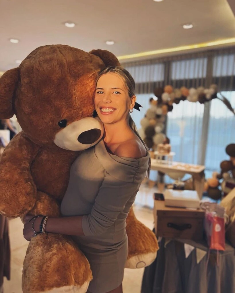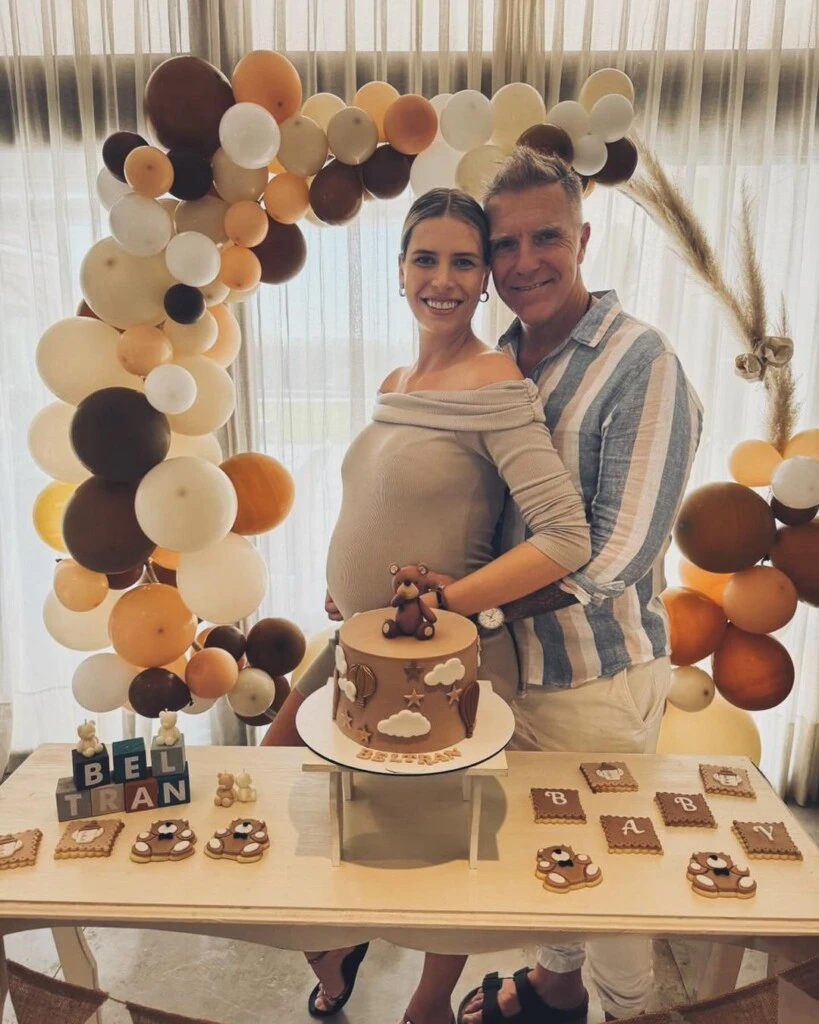 En las fotografías compartidas por los futuros padres se puede ver un arco de globos en tonos marrones, oro y camel. También algunos detalles como galletitas con diseño de osos de peluches y algunos banderines de tela en composé.