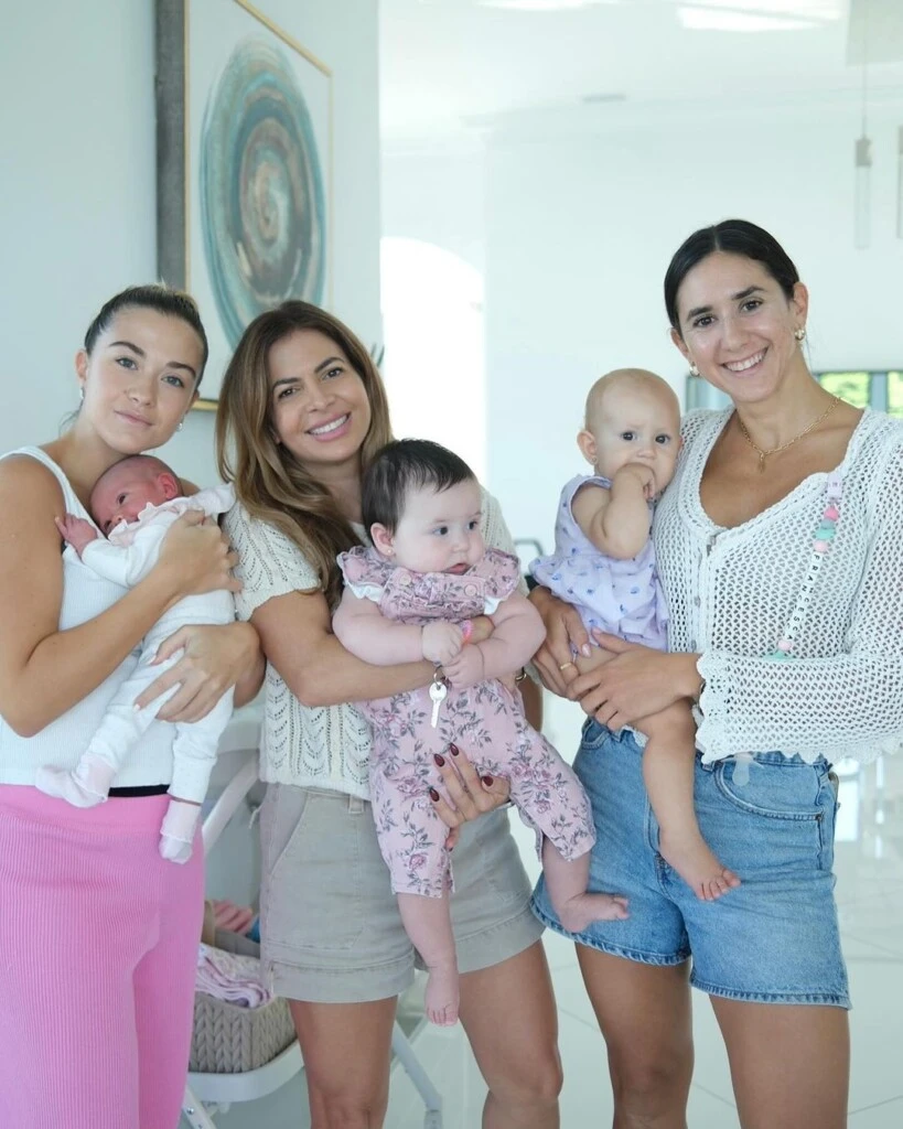 A su vez, en el posteo, Sofía compartió una postal del momento en que las tres bebés se conocieron, mientras Olivia estaba en el cambiador.