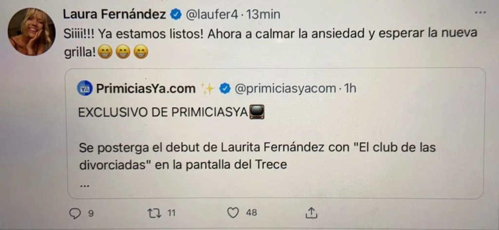 A raíz de esta noticia, la bailarina se expresó a través de su Twitter y opinó al respecto: “Siiii!!! Ya estamos listos! Ahora a calmar la ansiedad y esperar la nueva grilla!”, escribió.