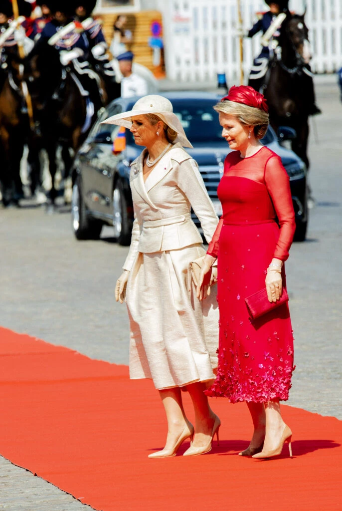 Si bien ambas optaron por looks monocromáticos, se diferenciaron bastante con el color que eligió cada una, y los detalles. En el caso de la monarca holandesa, se decantó por un look de inspiración años 50, concretamente del mítico traje Bar de Christian Dior, aunque el de Máxima es de Natan.