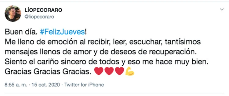 "Buen día. #FelizJueves! Me lleno de emoción al recibir, leer, escuchar, tantísimos mensajes llenos de amor y de deseos de recuperación. Siento el cariño sincero de todos y eso me hace muy bien. Gracias Gracias Gracias", escribió primero desde la red social del pajarito.