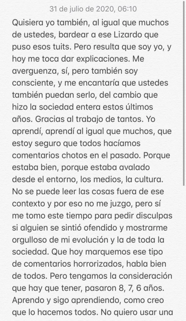 "Me avergüenza, sí, pero también soy consciente del cambio que hizo la sociedad entera estos últimos años", escribió el joven. Se refirió al cambio en la forma de expresarse y en la mirada al otro: "Yo aprendí, aprendí igual que muchos, que estoy seguro que todos hacíamos comentarios chotos en el pasado. Porque estaba bien, porque estaba avalado desde el entorno, los medios, la cultura".