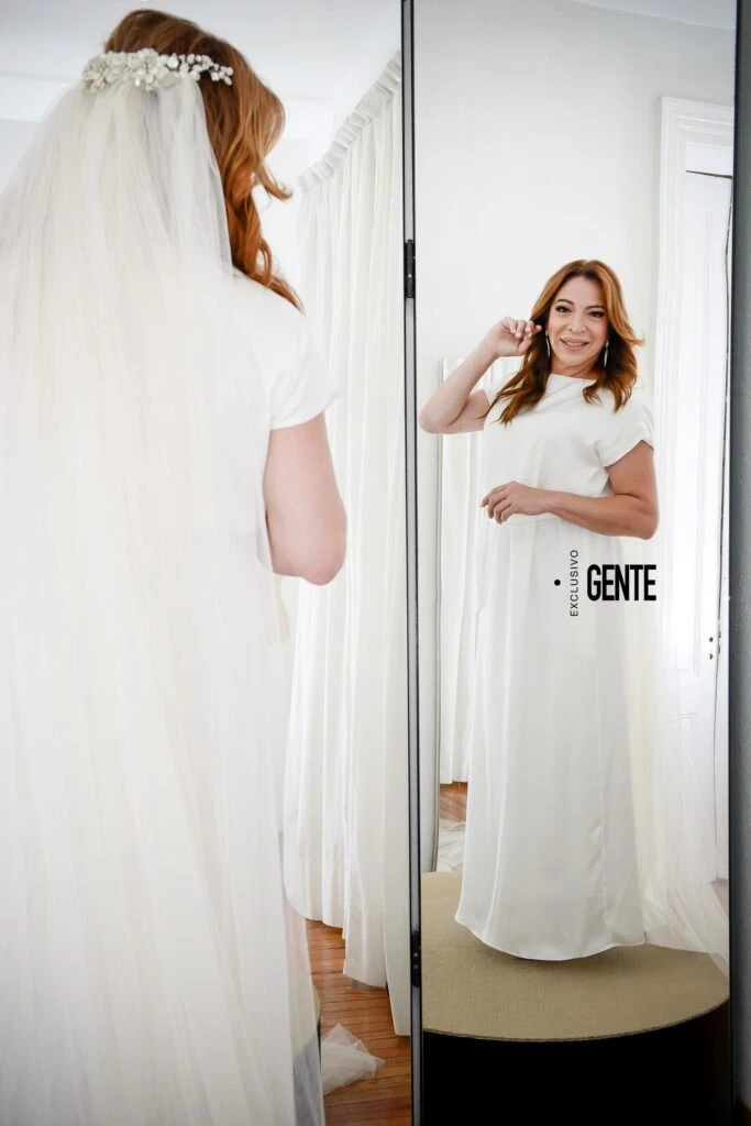 Lizy Tagliani está realmente radiante con su vestido de raso blanco -una túnica con escote bote, lazo y mangas cortas- y posa frente a un enorme espejo con su gran sonrisa.
