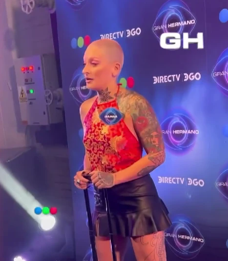El primer look de Juliana, con el que se presentó el 11 de diciembre para ingresar a la casa de Gran Hermano fue una pollera negra y un top rojo, mostrando sus tatuajes.