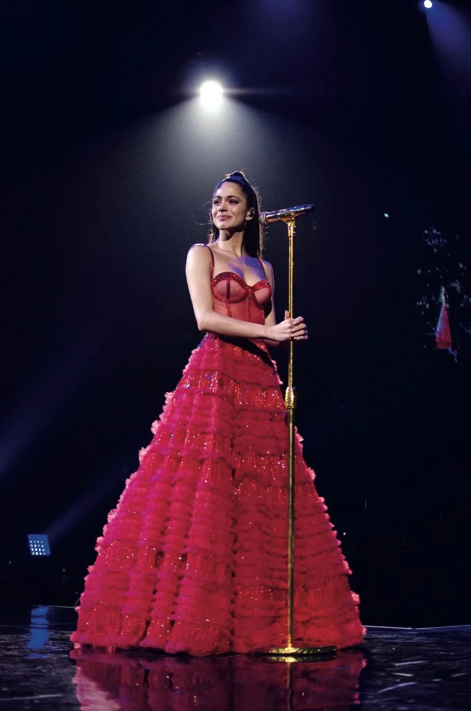 Siempre brillarás, Diciembre, Cristina, Oye, Consejo de amor y Por qué te vas los cantó con un vestido colorado en tul con una falda con volados y strapless con ribetes de shantung de Javier Saiach. Además, este diseño lo eligió para dar a conocer Diciembre, un tema inédito que estrenó acompañada por doce músicos.