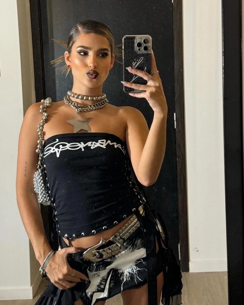 A esto le sumó una serie de detalles que combinaron perfectamente y que hicieron de este estilismo, un concepto único. La influencer sumó cinto metalizado con hebilla gruesa y tachas, botas bucaneras patente con taco fino y minibag con cadenas plateadas.