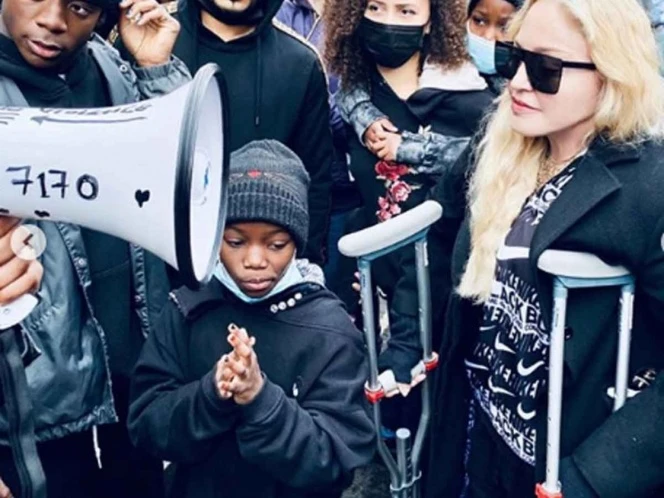 Su participación, al grito de “No hay justicia, no hay paz”, fue entre los manifestantes y en compañía de sus hijos. Vestida de negro, con gafas de sol y en muletas, la reina del pop se unió a las protestas para erradicar el racismo en Estados Unidos.