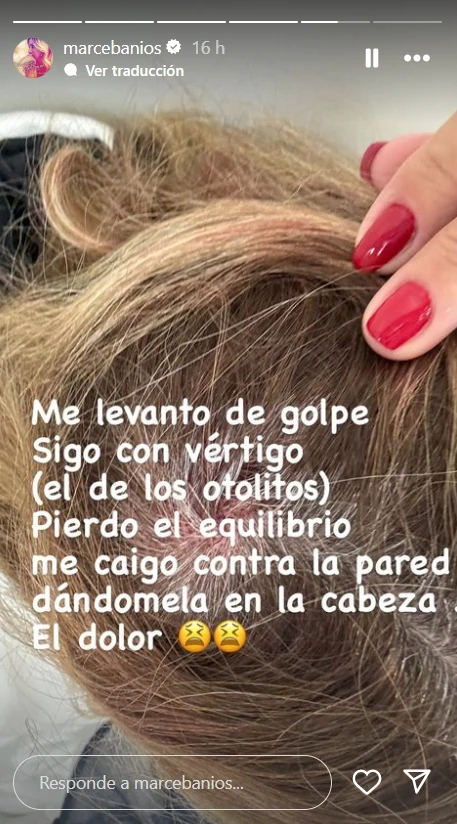 "Me levanto de golpe. Sigo con vértigo (por los otolitos). Pierdo el equilibrio y me golpeo contra una pared dándomela en la cabeza. El dolor...", expresó con emojis de sufrimiento, sobre una foto en primer plano de la herida que se hizo.