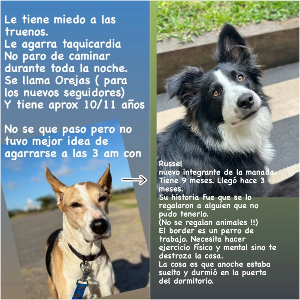 "No sé qué pasó, pero no tuvo mejor idea que agarrarse a las 3 AM con Russel, nuevo integrante de la manada", señaló, al mismo tiempo que compartió dos divertidas postales de sus compañeros. "Tiene 9 meses y llegó hace 3. Su historia fue que lo regalaron a alguien que no pudo tenerlo. ¡No se regalan animales!", aprovechó para manifestar.