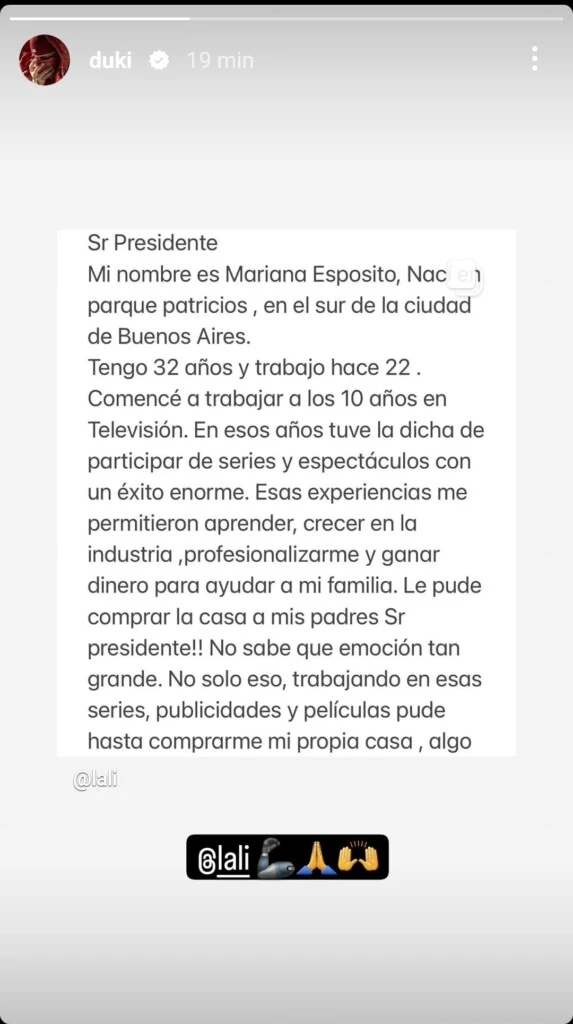 "Quiero seguir viviendo en democracia, quiero seguir escuchando voces diversas, quiero que mi compañera Lali Espósito siga cantando y trabajando tranquila como lo hace desde tan chica sin ser perseguida y que ojalá la vida nos cruce en un escenario algún día", concluyó.